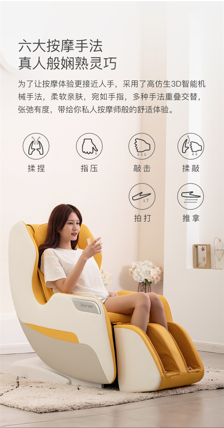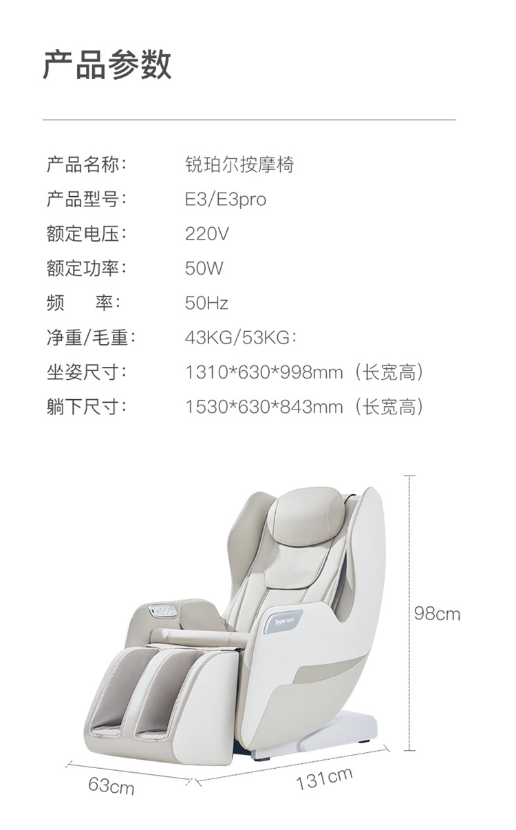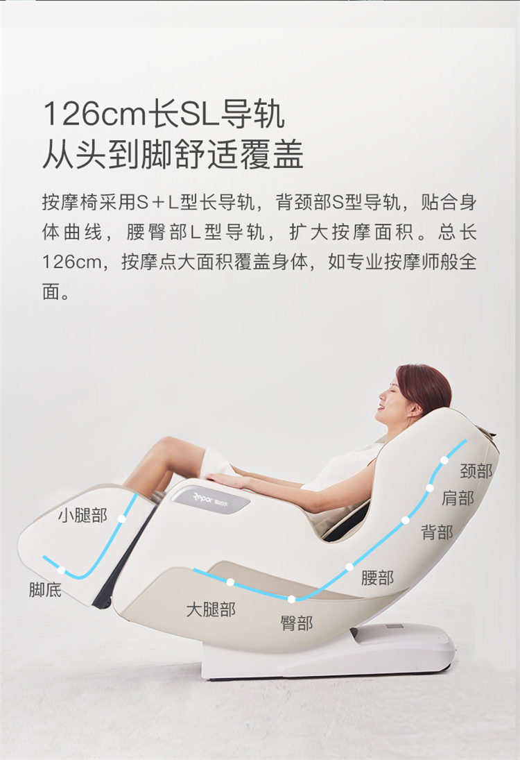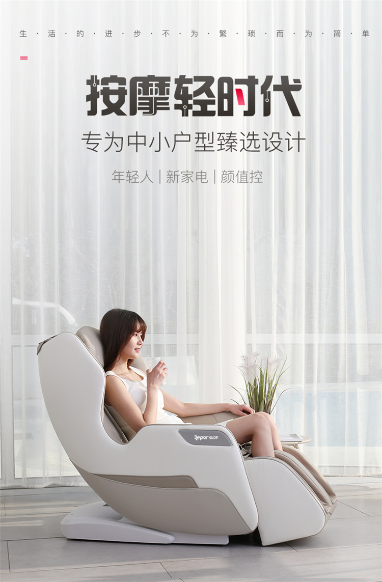 銳珀爾專為中小戶型設計的按摩椅E3 pro,具有SL長導軌、腰背貼身熱敷、腿足氣囊包裹、3D多維智能機芯、六大按摩程序、足底滾輪按摩和科技零重力、USB充電接口和0距離靠墻設計等硬核功能,符合年輕人健身養(yǎng)生的舒爽體驗。