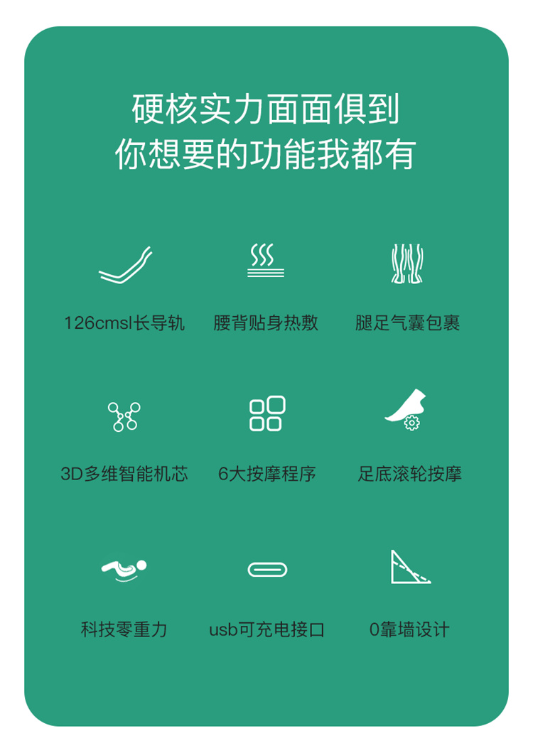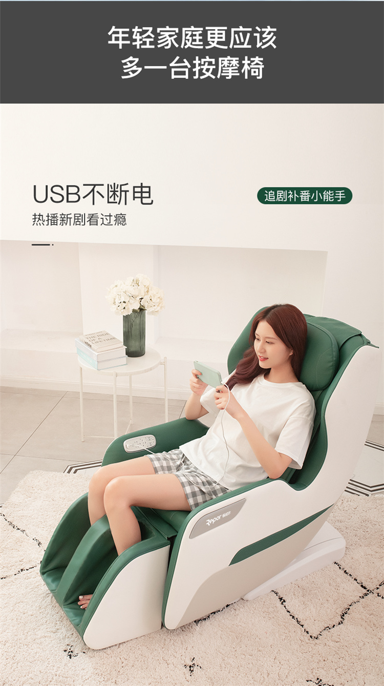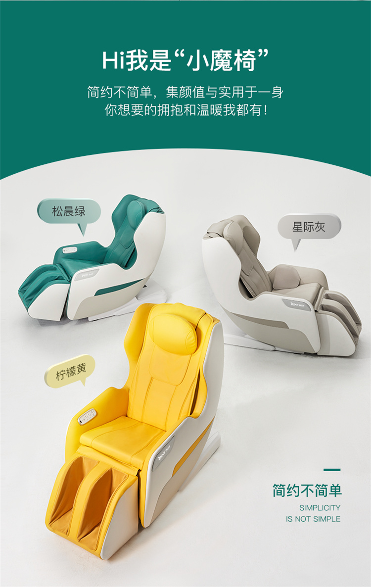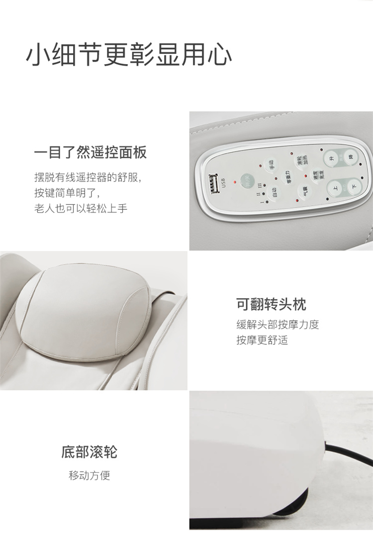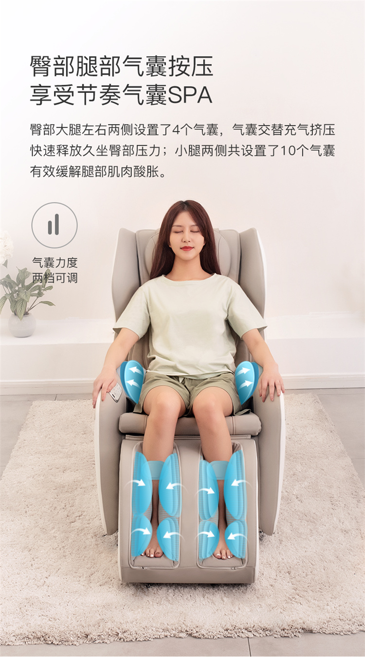 銳珀爾專為中小戶型設計的按摩椅E3 pro,具有SL長導軌、腰背貼身熱敷、腿足氣囊包裹、3D多維智能機芯、六大按摩程序、足底滾輪按摩和科技零重力、USB充電接口和0距離靠墻設計等硬核功能,符合年輕人健身養(yǎng)生的舒爽體驗。
