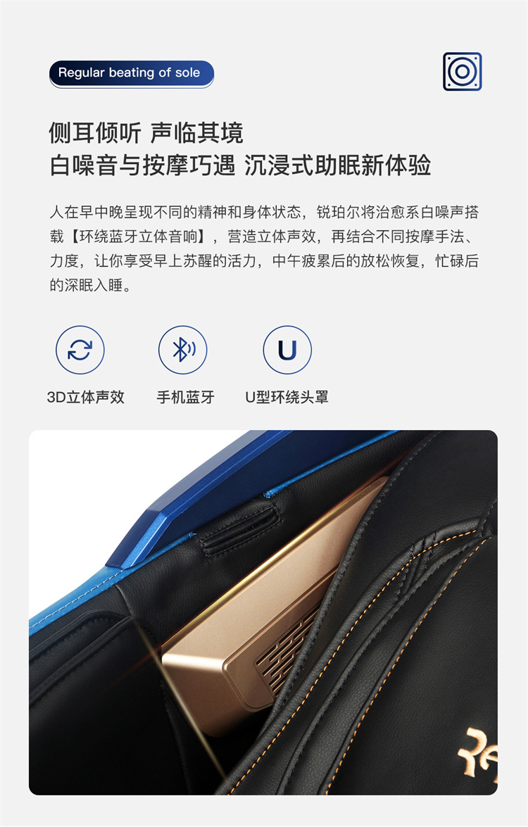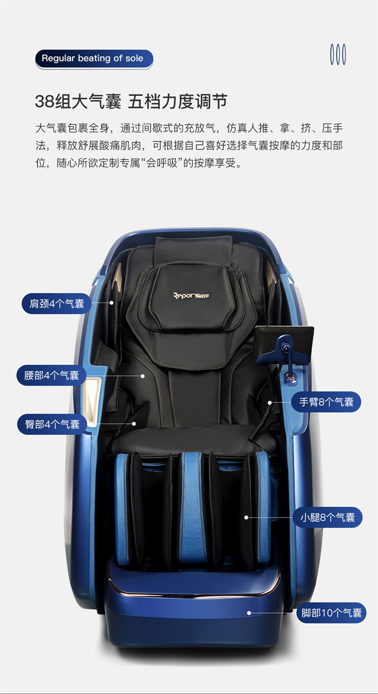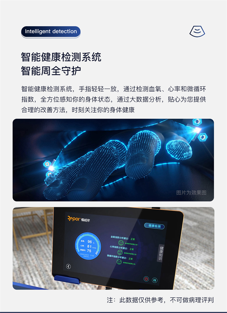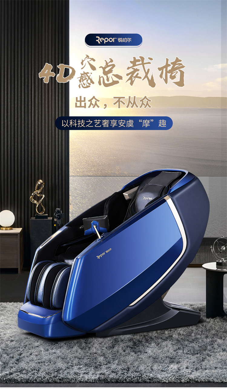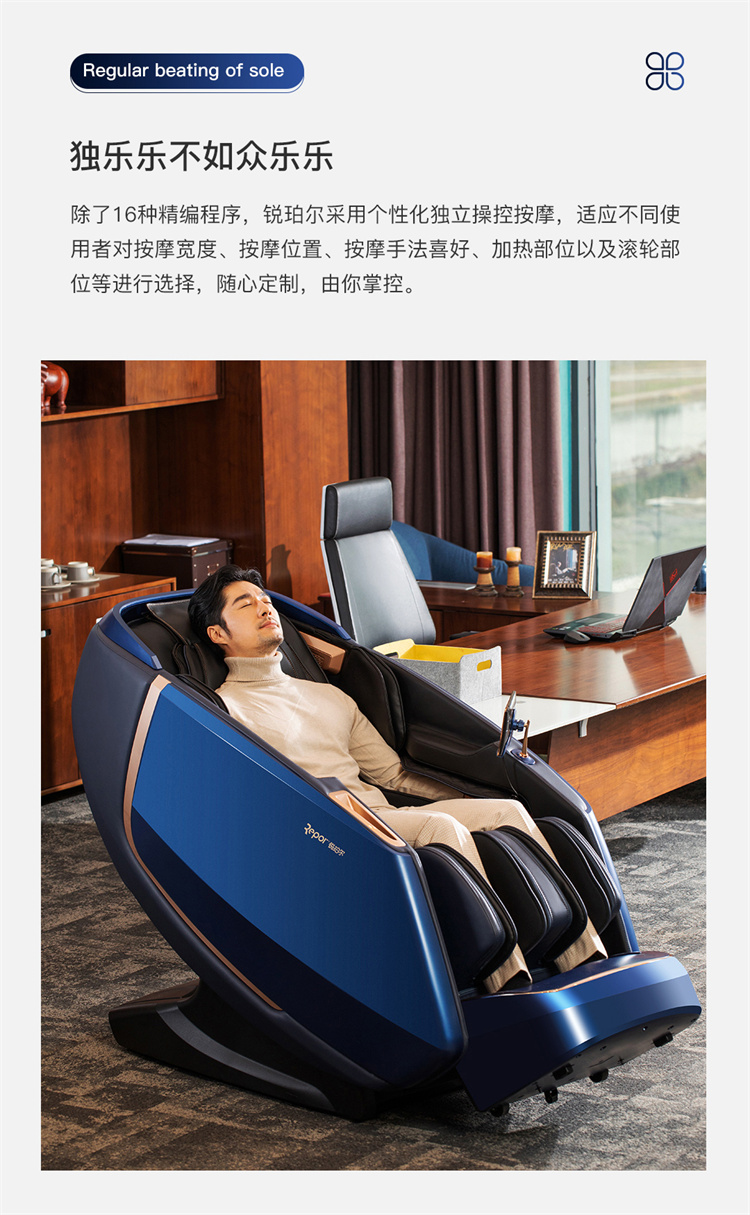 銳珀爾集十余年技術(shù)積累,傾力打造銳珀爾新款按摩椅4D穴感總裁椅,擁有全新的AI智能語音,小腿溫?zé)崛啻?、腳底震動、4D機械手等全新功能創(chuàng)新,智能健康體測,可以檢測血氧、心率、微循環(huán)等數(shù)值,通過大數(shù)據(jù)分析,給您提供合理的改善方法,時刻關(guān)注您的健康狀況;超大液晶智能觸控,專為總裁量身打造的特色按摩程序,20分鐘快速補充精力,多種按摩程序,滿足全家人的需求。