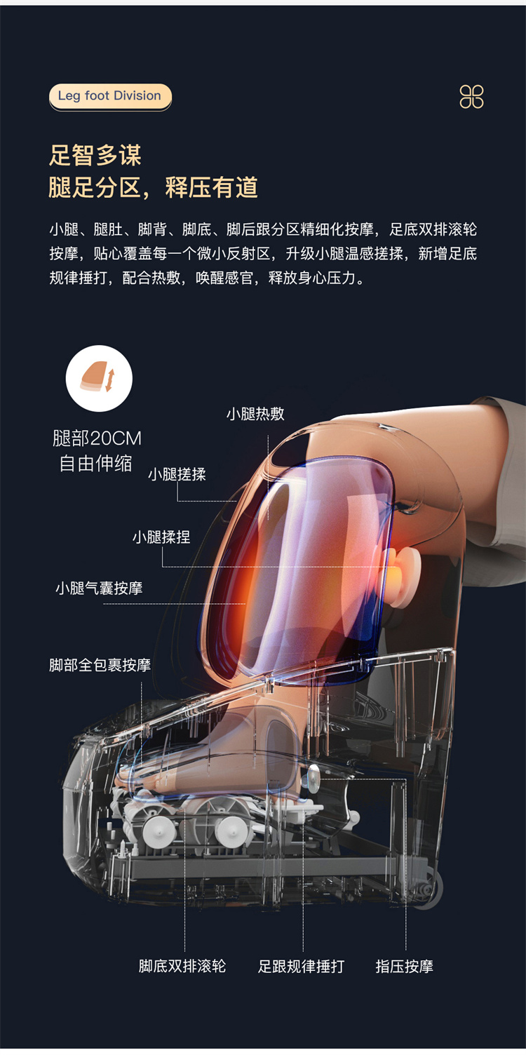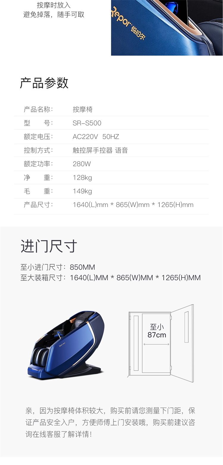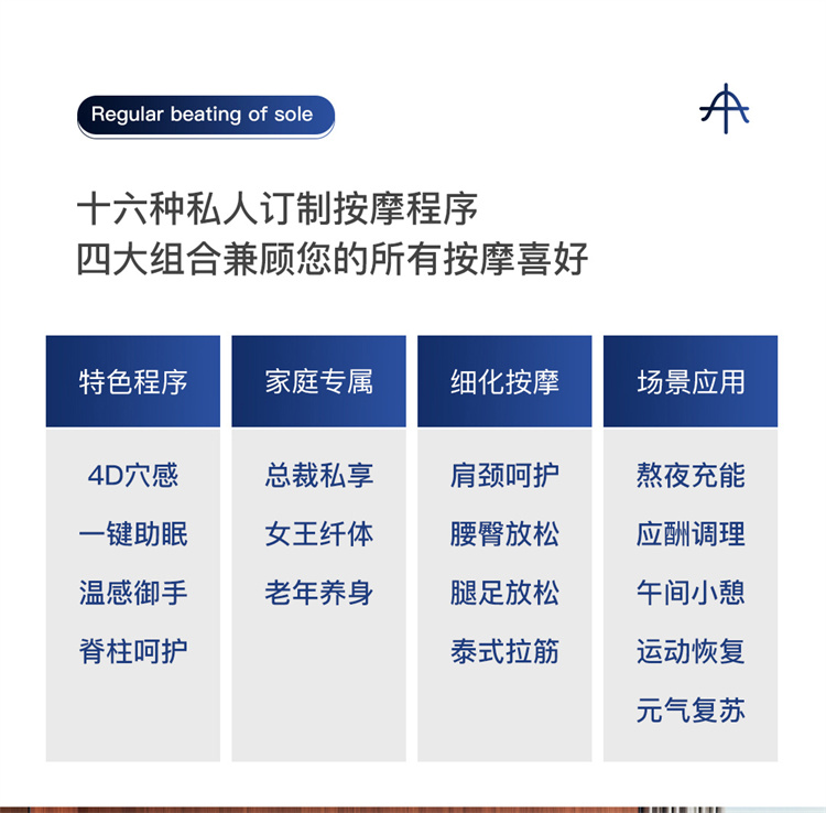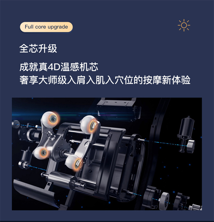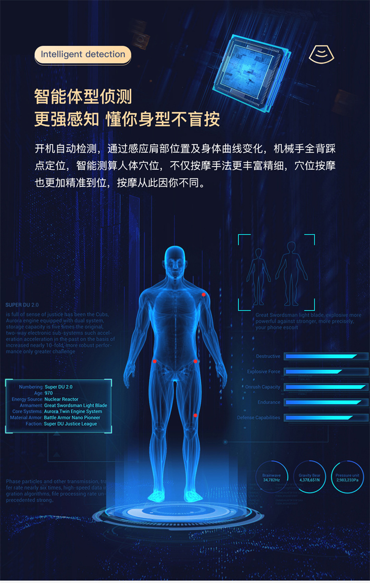 銳珀爾集十余年技術(shù)積累,傾力打造銳珀爾新款按摩椅4D穴感總裁椅,擁有全新的AI智能語音,小腿溫?zé)崛啻?、腳底震動、4D機械手等全新功能創(chuàng)新,智能健康體測,可以檢測血氧、心率、微循環(huán)等數(shù)值,通過大數(shù)據(jù)分析,給您提供合理的改善方法,時刻關(guān)注您的健康狀況;超大液晶智能觸控,專為總裁量身打造的特色按摩程序,20分鐘快速補充精力,多種按摩程序,滿足全家人的需求。
