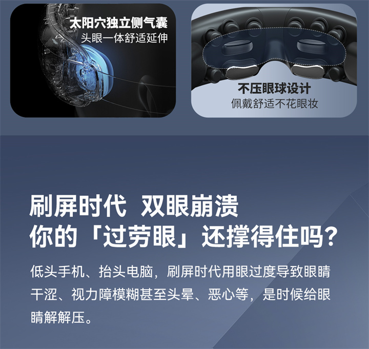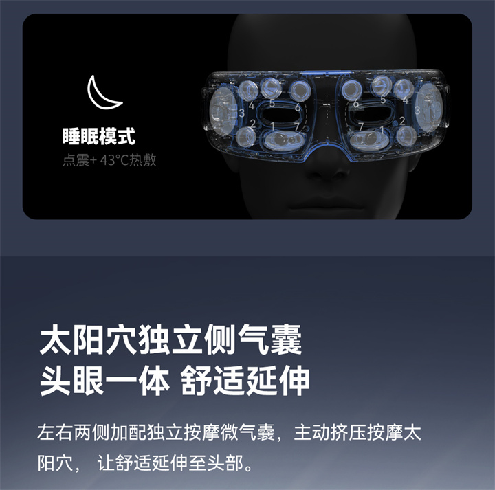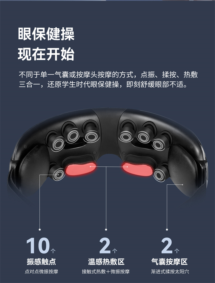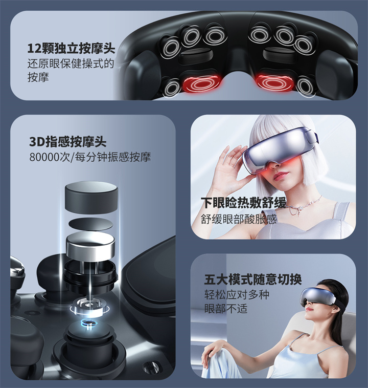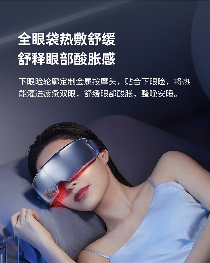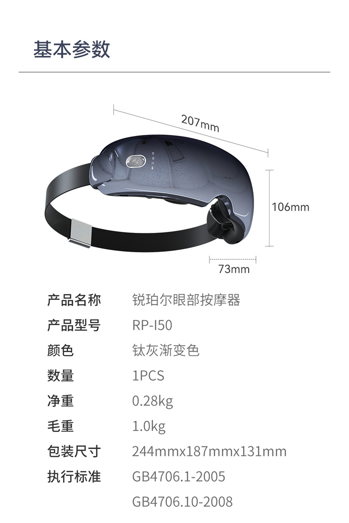 銳珀?duì)柨砂刺?yáng)穴的眼部按摩器RP-I50,根據(jù)國(guó)人眼型設(shè)計(jì),機(jī)身弧度更貼合眼眶,貼心預(yù)留立體凹槽,保護(hù)眼球,按摩后視力不模糊,自帶應(yīng)急可視窗,可舒緩全黑密閉焦慮感;內(nèi)置大自然的場(chǎng)景音效,讓眼睛和心靈雙重放松,還有藍(lán)牙連接,可以隨心聽(tīng)歌、聽(tīng)書(shū)等,更多神奇功能,等待您親自試戴發(fā)現(xiàn)……